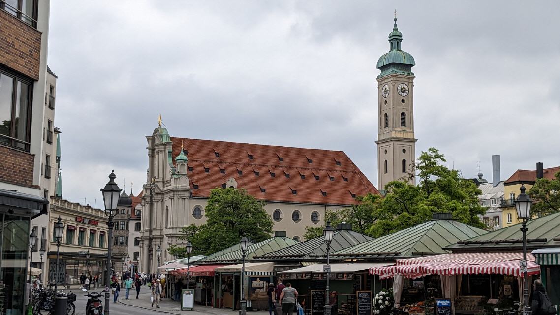 Die Heilig-Geist-Kirche direkt am Viktualienmarkt ist das letzte Überbleibsel des ersten Münchner Krankenhauses, dem Heilig-Geist-Spital. Dieses wurde bereits um 1200 von Herzog Ludwig I. dem Kelheimer gegründet und wurde von einem Meister und Brüdern betrieben. Auf dem Gelände des alten Spitals wurde später die Heilig Geist Kirche erbaut und das Spital an anderer Stelle deutlich größer betrieben. Optisch ist die Kirche ein reich ausgestattetes Kleinod und nicht nur bei Touristen ein beliebter Foto-Spot. In den historischen Räumlichkeiten finden regelmäßig Kunstinstallationen und moderne Gottesdienste statt. Aus Heilig Geist ist außerdem die Gemeinde St.Maximilian heraus entstanden, die wir noch später auf der Strecke besuchen werden.