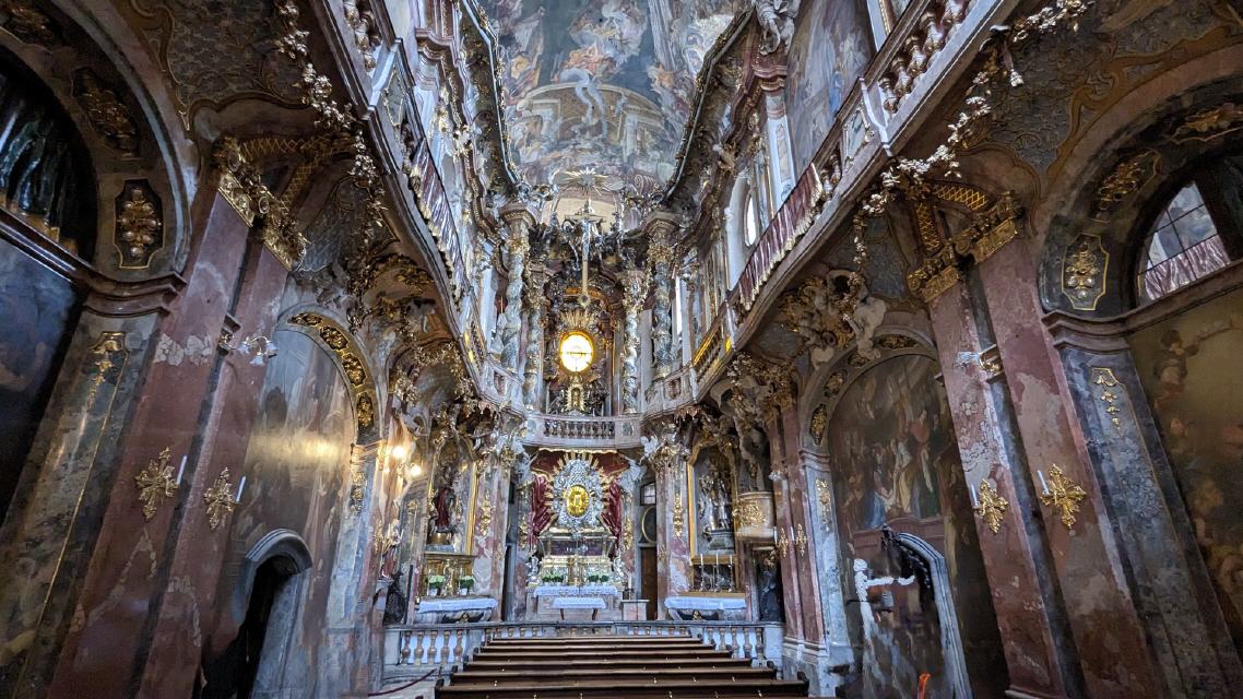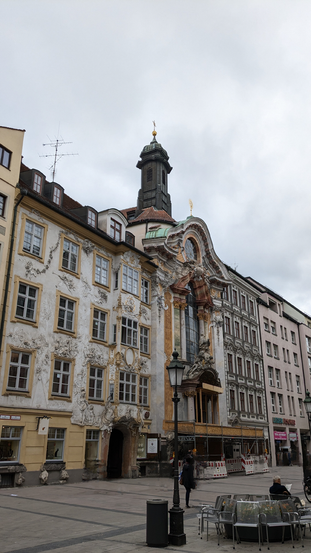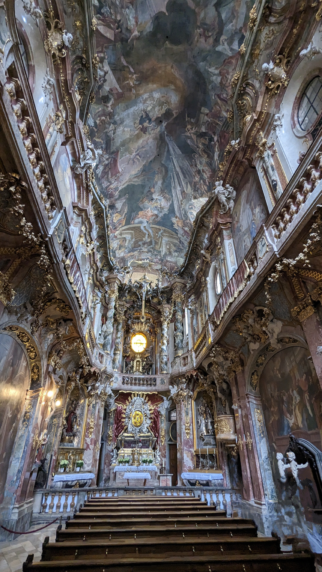 Die kleine Barockkirche fällt in der Häuserreihe in der Sendlinger Straße fast nicht auf, aber dem Besucher und der Besucherin bietet sich im Innern ein opulenter Innenraum mit Blattgold, fein ausgearbeiteten Fresken und wunderschönem Stuck ein Anblick, der einen schon fast überfordert ob der kitschigen Überfrachtung. Eigentlich heißt die Kirche St.Nepomuk, bei den Münchner ist sie jedoch nach den beiden Bauherren benannt, den Brüdern Cosmas Damian und Egid Quirin Asam.