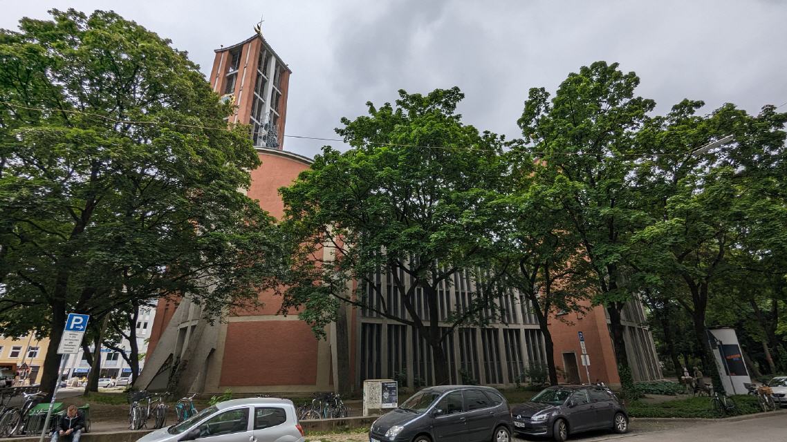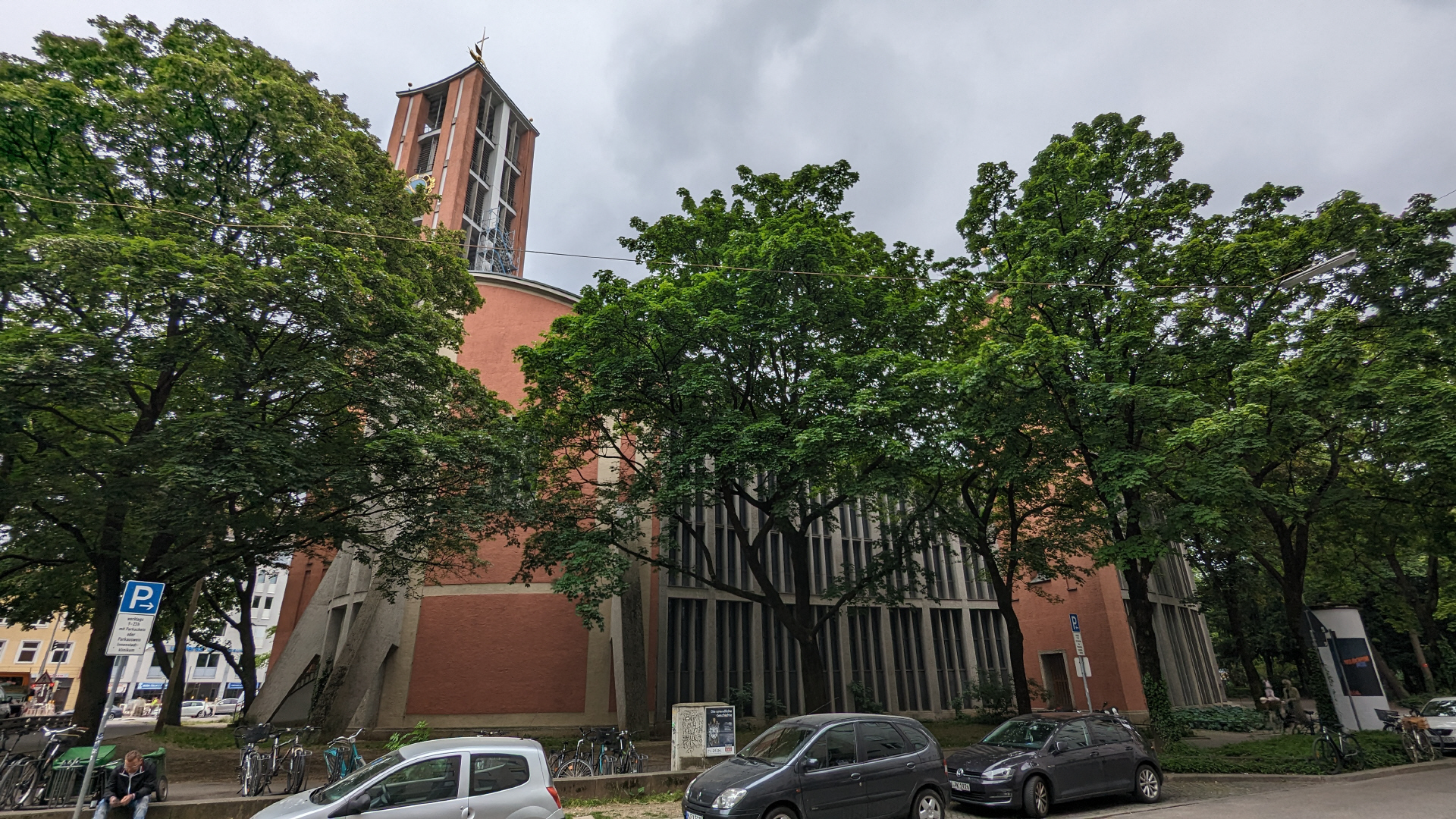 St.Matthäus, eine der wenigen evangelischen Kirchen auf unserer Runde, hat so markante Spitznamen wie "Sprungschanze Gottes" oder "Luthers Achterbahn". Wer sich die Dachgestaltung der Kirche anschaut begreift sofort warum. Die seit 1955 geweihte Kirche fällt besonders durch die asymetrischen Formen auf, die durchaus irritieren können, wenn man an die typisch bayerisch-barocken Kirchenbauten gewöhnt ist. Auch wenn der Kirchenbau eher nüchtern wirkt, der Architekt Gustav Gsaenger hat dennoch einiges an christlicher Symbolik im Innenraum untergebracht.