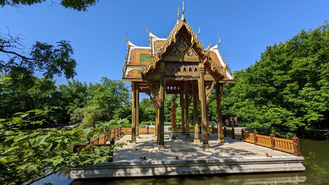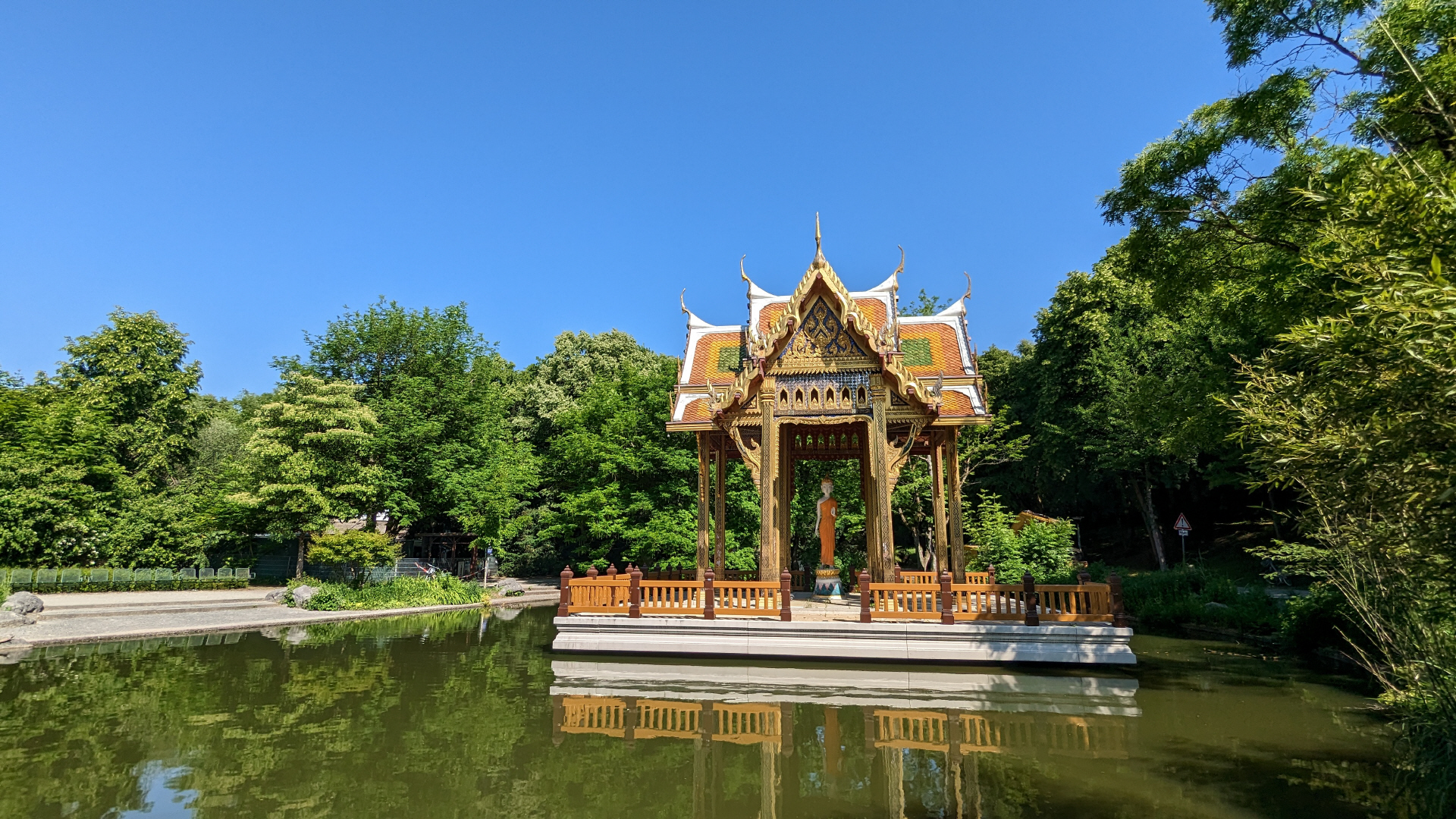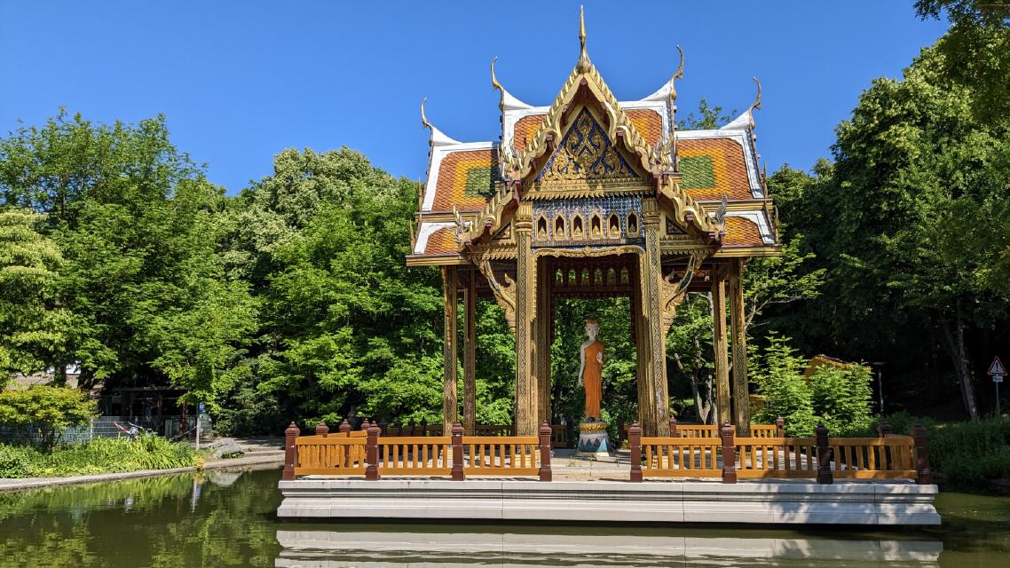Zweites Highlight im Asien-Ensemble des Westparks ist der thailändische Pavillon-Tempel. Der in der Mitte befindliche Buddha ist das erste freistehende Buddha-Heiligtum in ganz Europa und ein wunderschönes Meisterwerk. Der Pavillon befindet sich mitten im Wasser und kann daher nur aus der Entfernung betrachtet werden.