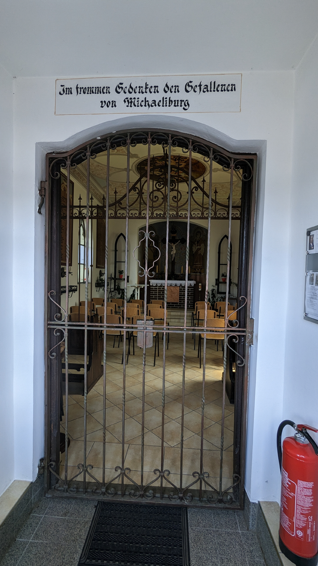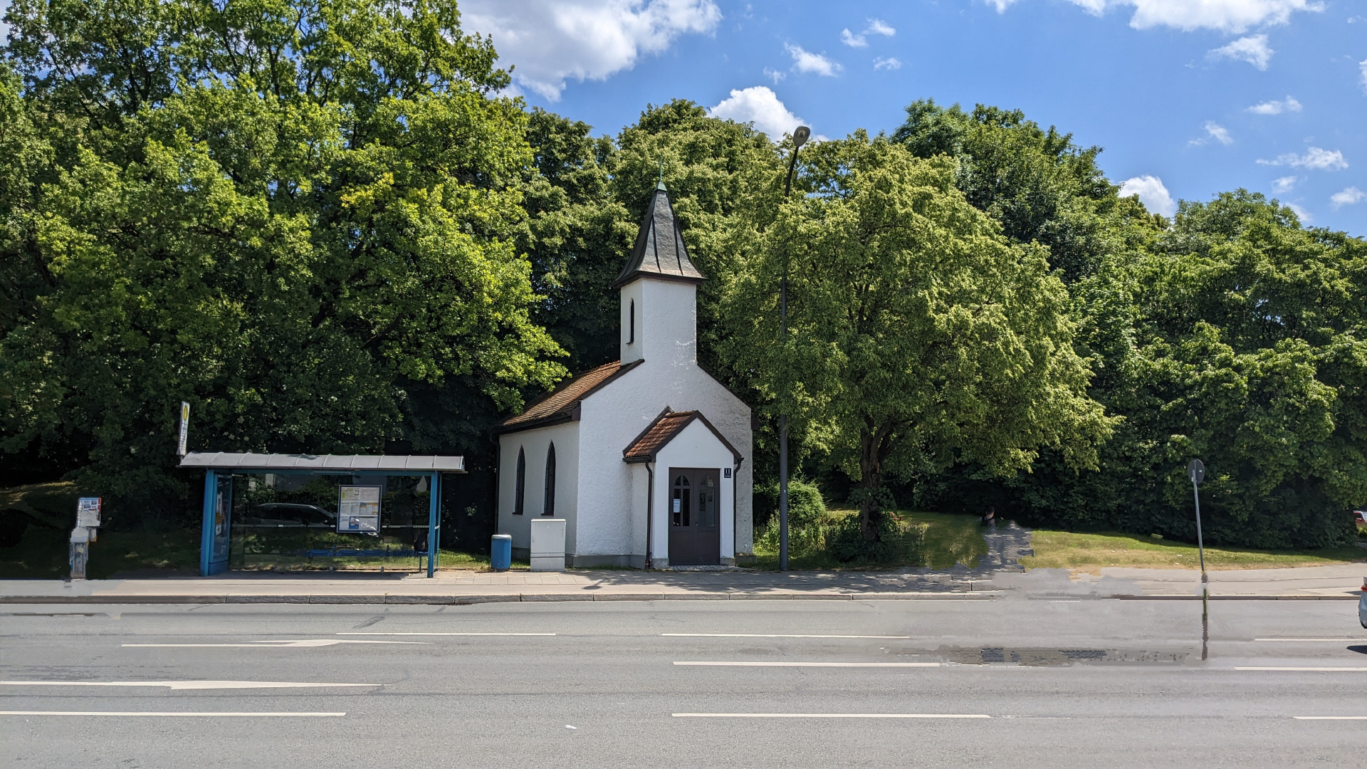 Für das kleine Stoßgebet zwischendurch muss es ja nicht immer ein großes Gotteshaus oder ein Tempel sein. Auch eine kleine Kapelle kann schnell Abhilfe schaffen, wenn man ein Gebet gen Himmel schicken möchte. Da wir uns ja schon fast auf der Zielgerade befinden, könnte ein kleines Gebet jetzt angebracht sein. Dafür passieren wir die St.Michaelskapelle an der Kreuzung Heinrich-Wieland-Straße und Albert-Schweitzer-Straße. Die Kapelle ist den Gefallenen von Michaeliburg gewidmet und hat eine stürmische Vergangenheit seit 1900 durchlebt: Als Notkirche und Lagerraum, als zu kleines Gotteshaus für die umliegende Gemeinde und immer wieder in den Kriegswirren geplündert. Heute kümmert sich ein Verein um die kleine Kapelle direkt am Straßenrand, die im Verkehrsgewühl leicht übersehen wird.